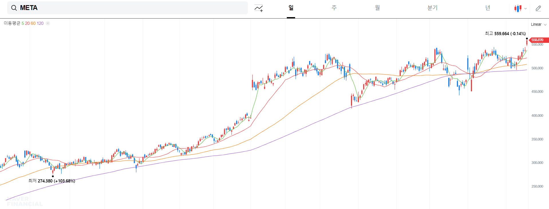 메타는 2024년부터 배당금을 지급하기 시작했는데요. 1주에 $0.50원으로 배당금을 지급하기 시작해서, 배당금을 그대로 유지하고 있는데요. 이 때문에 최근 주가가 계속 상승하면서 배당수익률은 감소세에 있으며, 2024년 평균 배당수익률은 0.40%을 기록했습니다.