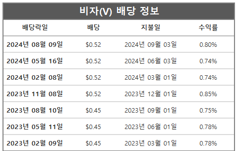 비자의 배당일은 3, 6, 9, 12월이고, 배당락일은 모두 1달 전인 3, 6, 9, 12월이며, 평균적으로 약 1달 후에는 배당금이 지급되고 있습니다.