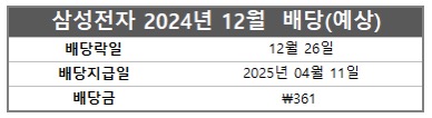 아직 2024년 12월 배당일정은 확정되지 않았으나, 기존 일정을 고려해 배당일을 예상해 보자면 배당락일은 12월 26일, 25년 4월 둘째 주 금요일인 4월 11일에 1주당 361원의 배당금을 받을 수 있는 것으로 예상됩니다.