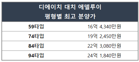 디에이치 대치 에델루이 분양가는 동일한 평형일지라도 분양가가 상이한데요. 전용면적별 최고 분양가를 정리해드리면, 59타입은 16억4,340만원, 72타입은 19억2,450만원, 84 타입은 22억3,080만원, 94 타입은 24억1,840만원으로 평당 분양가는 6,530만원 정도입니다.