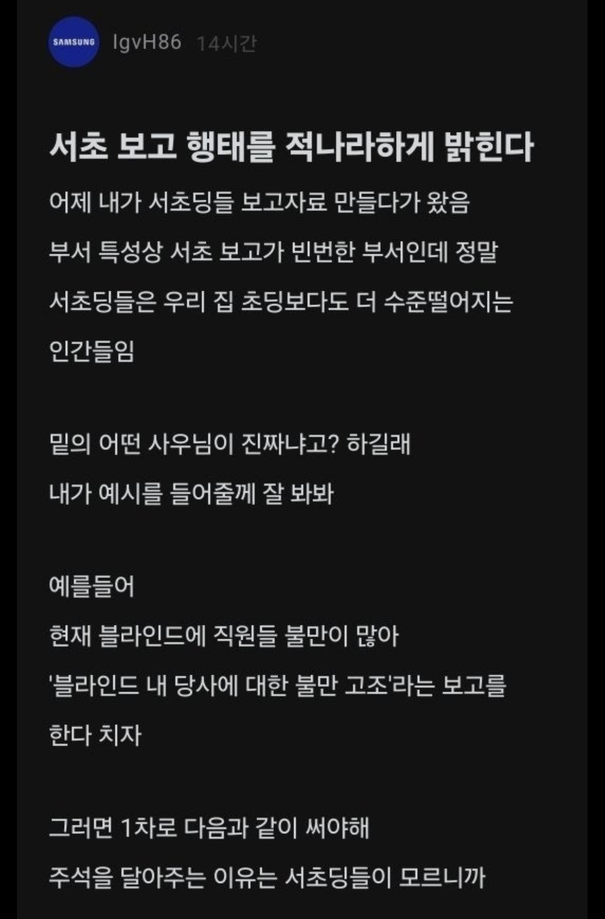 최근 블라인드에 올라온 삼성전자 임직원의 글이 ‘지금이 2024년이 맞나?’ 눈을 의심하게 만들었습니다. 일면 ‘서초딩’ 사건이라 불리는 이 이야기는 삼성전자 내부에 만연한 비효율적인 보고서 작성 방식을 완벽하게 이해시켜줬습니다.