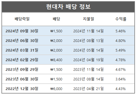 현대차는 2022년까지는 중간, 기말 배당으로 지급되던 배당금을 2023년에는 2, 3분기와 기말 배당으로 배당 지급일을 추가했고, 2024년에는 1, 2, 3분기 배당을 지급하고 앞으로 4분기 배당을 지급할 예정으로 수익을 주주에게 환원하려 노력하는 국내에 찾아보기 힘든 배당주 종목 중 하나인데요.