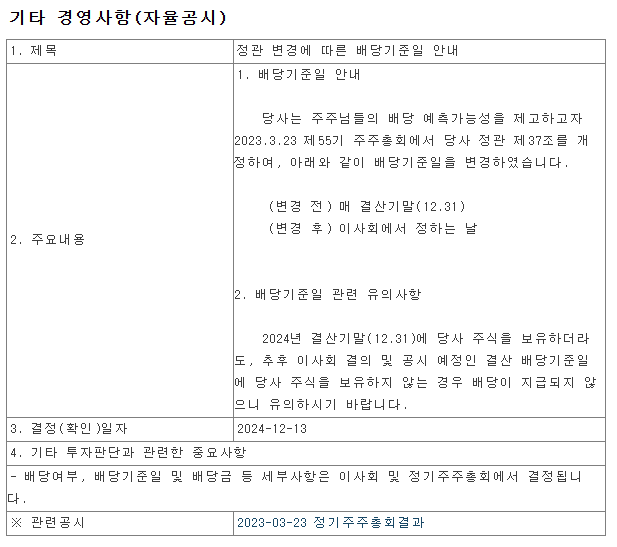 그랬더니 현대차의 배당기준일이 변경된 것을 확인할 수 있었습니다. 원래는 매 결산기말(12/31)을 기준으로 배당락일이 정해지고 배당금이 지급되었는데요. 올해부터는 이사회에서 결정하는 날로 일정이 변경되었습니다. 그리고 현재(1월 초)까지는 언제가 현대차 배당락일이 될지는 결정되지 않았습니다.