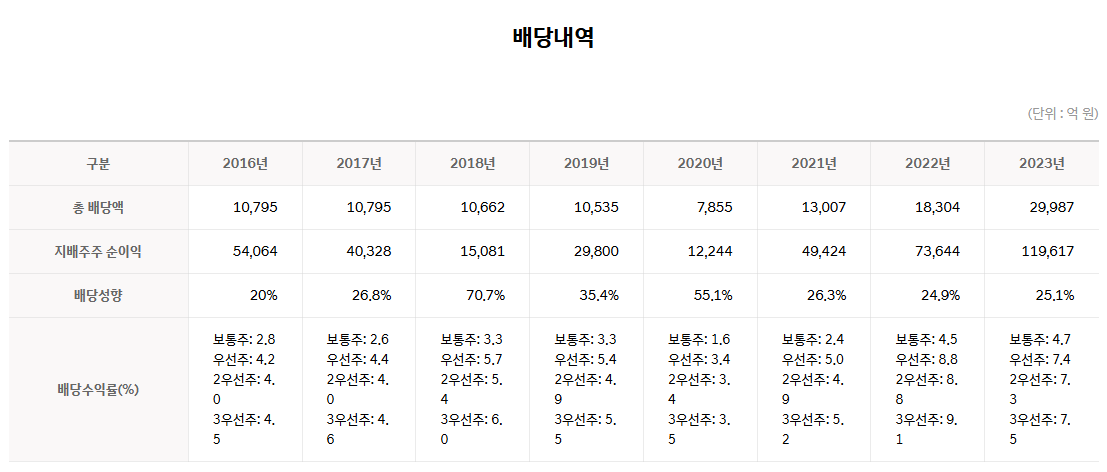 첫째, 지배주주귀속순이익 25% 이상 배당하여 배당가시성 및 안전성을 확보한다고 합니다. 보통 주주들이 배당금을 예측하지 못하다 받는 것과 다르게 지배주주 귀속 순이익 25%를 배당하여, 배당금을 대략적으로 예측가능해졌습니다.
