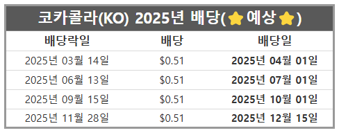 기존 일정과 배당금을 토대로 코카콜라의 2025년 배당일을 예상해보면 다음과 같습니다.